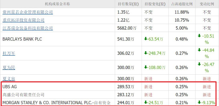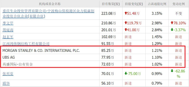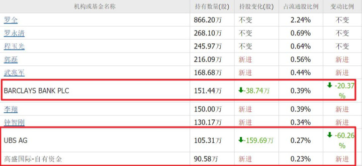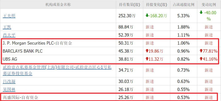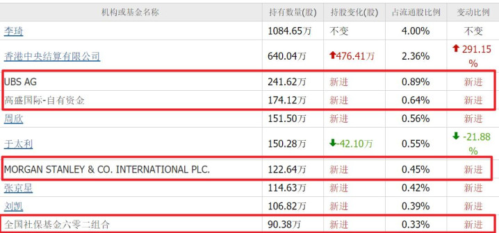 瑞银新进241万股;高盛新进174万股;摩根斯坦利新进122万股;社保基金六零二组合新进90万股,分别位列第三、四、七、十大流通股东。